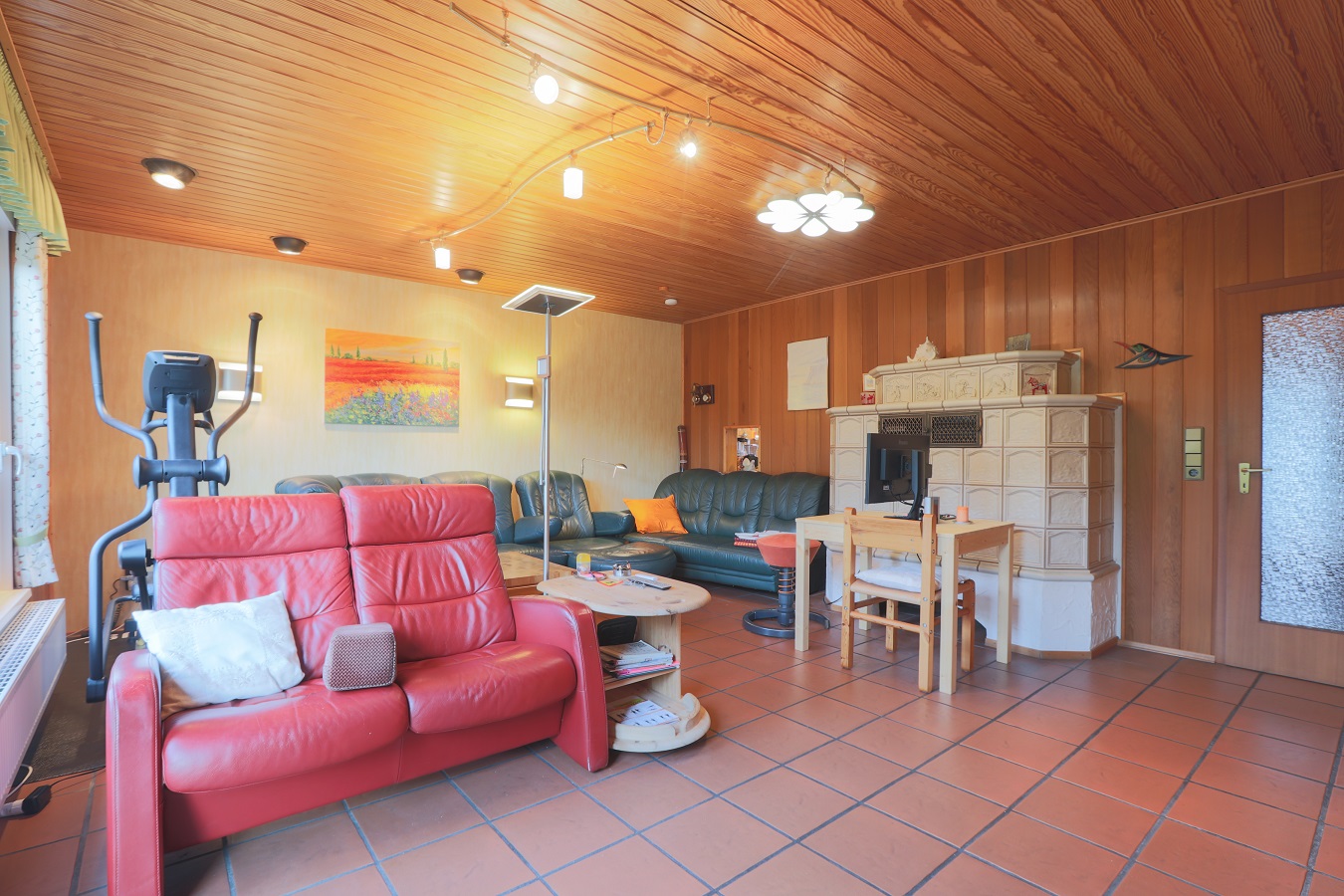 Vom großen Wohnzimmer mit Kachelofen sowie vom Schlafzimmer lässt sich der schön angelegte Garten betreten.