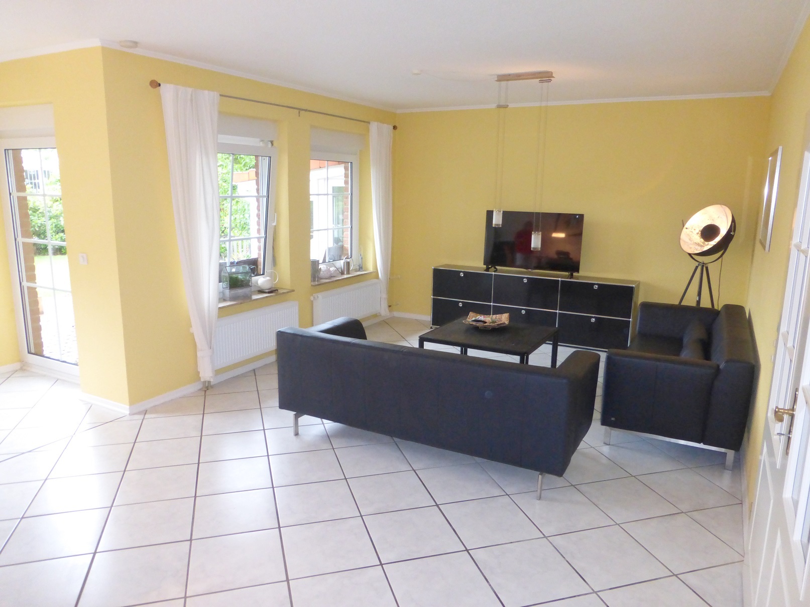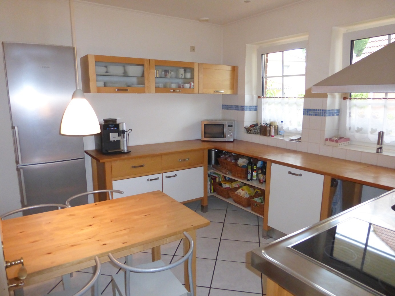 Durch den großzügigen Flur gelangen Sie in die Küche. Hier haben Sie Platz für einen kleinen Tisch für 4 Personen und die Möglichkeit, die vorhandene Küche kostenlos zu übernehmen. Das Wohnzimmer bietet sehr viel Platz für Esstisch und Couchlandschaft. Von hier gelangen Sie auf die teilüberdachte Terrasse mit Markise. Ein angrenzender Raum bietet sich als kleiner Partyraum an. Eine große Garage mit anliegendem Geräteraum rundet das Angebot ab. Im Erdgeschoss haben Sie zusätzlich einen großen Abstellraum und einen kleineren unter der Treppe. Im gesamten Erdgeschoss liegen pflegeleichte, helle Fliesen.