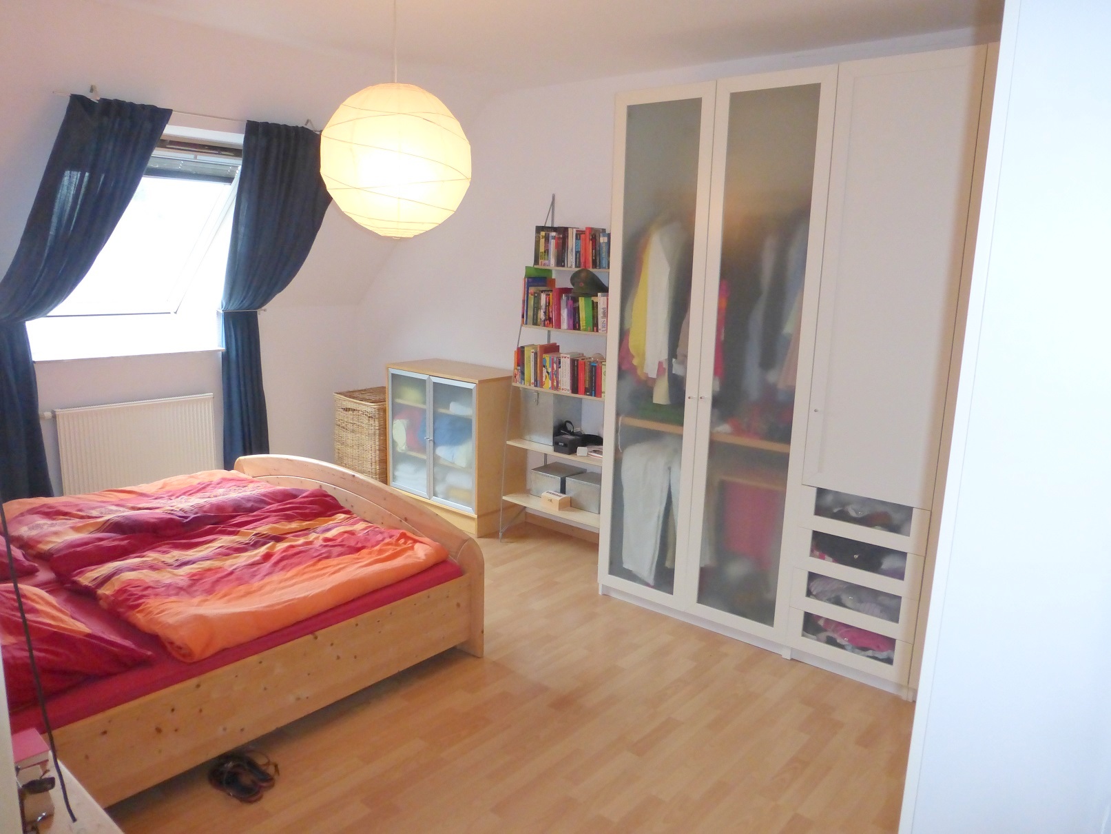 Im ausgebauten Dachgeschoss haben Sie ein 4. Schlafzimmer mit angrenzendem begehbarem Kleiderschrank. Hier ist es urgemütlich durch die Schrägen und die schicken, frei liegenden Dachbalken.