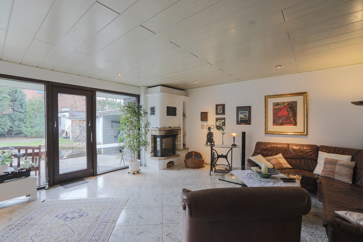 Im Erdgeschoss befindet sich ein sehr helles und großzügiges Wohn/Esszimmer mit Blick in den Garten und auf die Terrasse. Der Kamin wärmt und ist gemütlich.