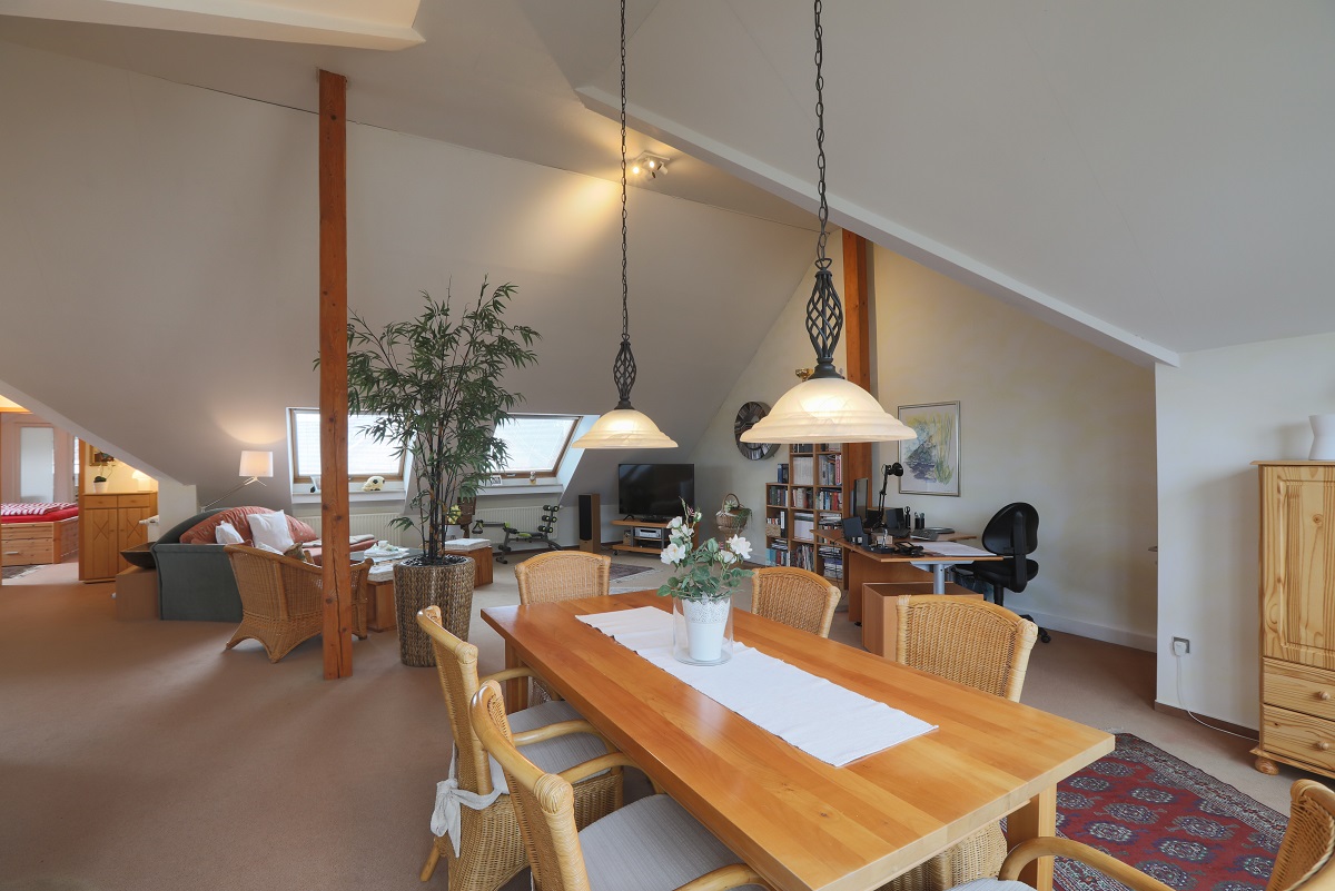 Sobald Sie die Treppe nach oben gehen, stehen Sie in einem 70m² großen Raum, zurzeit als zweites Wohnzimmer genutzt mit offener Küche Nummer 2. Zusätzlich gibt es ein Badezimmer mit Dusche, sowie ein Schlafzimmer mit angrenzendem Wintergarten.